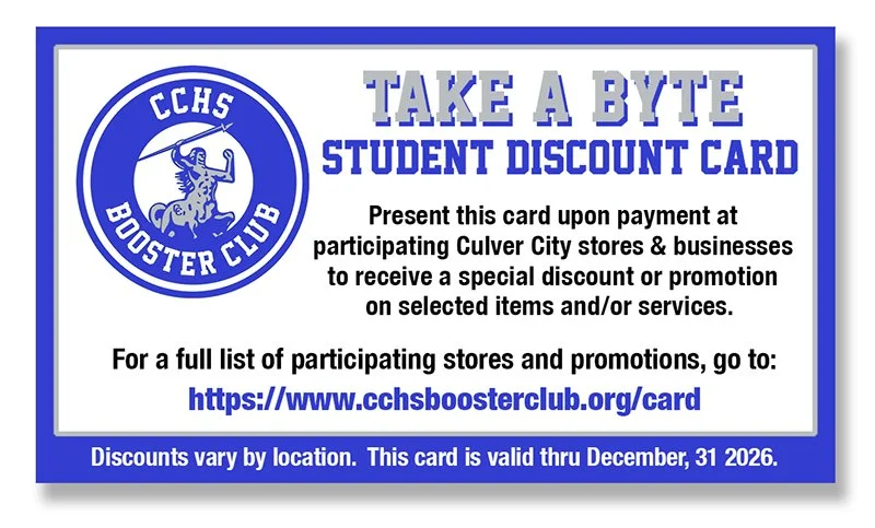If you participate on one of the CCHS teams that is sponsored by the Booster Club, you will receive a “TAKE A BYTE” Student Discount that can be used by you or any member of your family who shows the card at checkout at any of the following local stores and businesses.